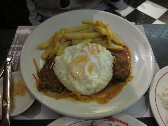 By this time, it was time to think about getting dinner before having to head to the airport…already. We wandered through the Candelaria district for a bit, but it looked like most of the restaurants were either closed or maybe hadn’t opened yet, so we made the executive decision to eat at the first place that looked halfway decent called La Romana (again, slim pickins) which ended up being semi-Italian. The food actually wasn’t too bad – I had a grilled steak with fries while Doug got the same but with tomato sauce and a fried egg. The Tappsi taxi-hailing app actually worked this time, and we successfully got to the airport way early, so we picked up our obligatory magnet and enjoyed a round of beers at “American Bar,” the only bar we could find.