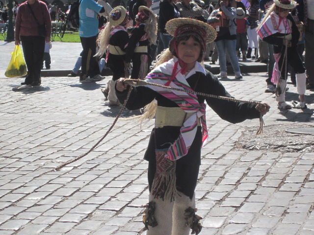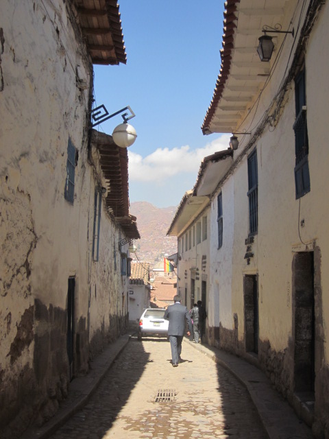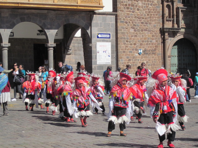 The reason our hotel had such a nice view of the city was that we were situated high, way up high atop a hill in the San Blas neighborhood. This meant a steep uphill climb from the Plaza de Armas, the main square, followed by more steps up a pedestrian alley to our hotel. While this normally could be somewhat comparable to our 4th floor walkup, this was a whole new ballgame with Cusco situated 2600 meters (8500 ft) above sea level, which left us gasping for air with every step. Thankfully, the downhill trek to the Plaza was much easier! By 10am, the square was bustling, with oratories, performances, and parades lining the giant basilica and adjacent cathedral. We found a spot overlooking the Plaza called Cappuccino Cafe, where we enjoyed a small breakfast of a tamale, almond tea, and orange juice while people-watching over the square. By the time we were done, it was certainly time to check in, and time for a much needed nap.