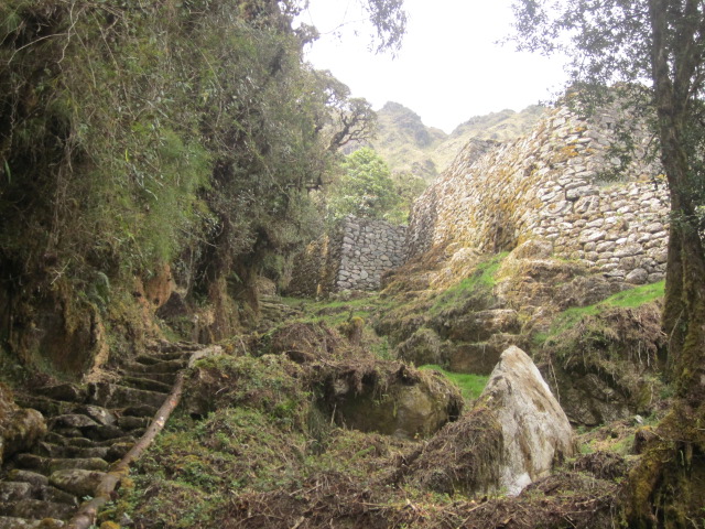 The morning’s hike was one of the most spectacular we’d seen, with breathtaking vistas that tumbled into mossy forests. We took a quick lunch break right after arriving at Conchamarca. Thankfully, today wasn’t nearly as brutal in terms of altitude, but it was nice to get a break knowing we had the longest distance to travel today. Following lunch, we reached our third summit, and shortly thereafter arrived at another stunning set of ruins, Phuyupatamarca, aptly named “above the clouds.” This particular site featured multiple wells serviced by aqueducts, and the belief was that many of these houses belonged to the military, whose windows faced Machu Picchu and could provide for faster communication. The afternoon’s hike was aptly named “Tourist Killer” due to the crazy number of steep, uneven, narrow steps down, down, and down some more. It definitely did a number on everyone’s knees!