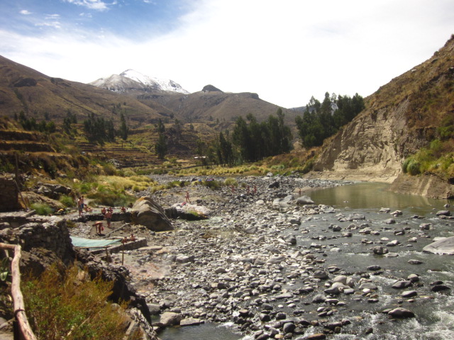 After the flight of the condors, we continued on through the valley, stopping at a few more viewpoints to see the valley in near-entirety, with the Colca River bisecting the many intricate terraces built right into the canyon’s walls. After a few stops at these viewpoints, we got to wander out for a longer side trip to the La Calera hot springs to soak our sore muscles in some VERY hot mineral springs situated right outside. There were probably 8 or so “tubs” for visitors to sit in, serviced by the mineral springs nearby and flowing from one tub into another, that each varied in temperature. If you can overlook algae turning some of the pools a bizarre shade of green (this is what they recreate in spas anyways right?!), it was actually a pretty cool experience!