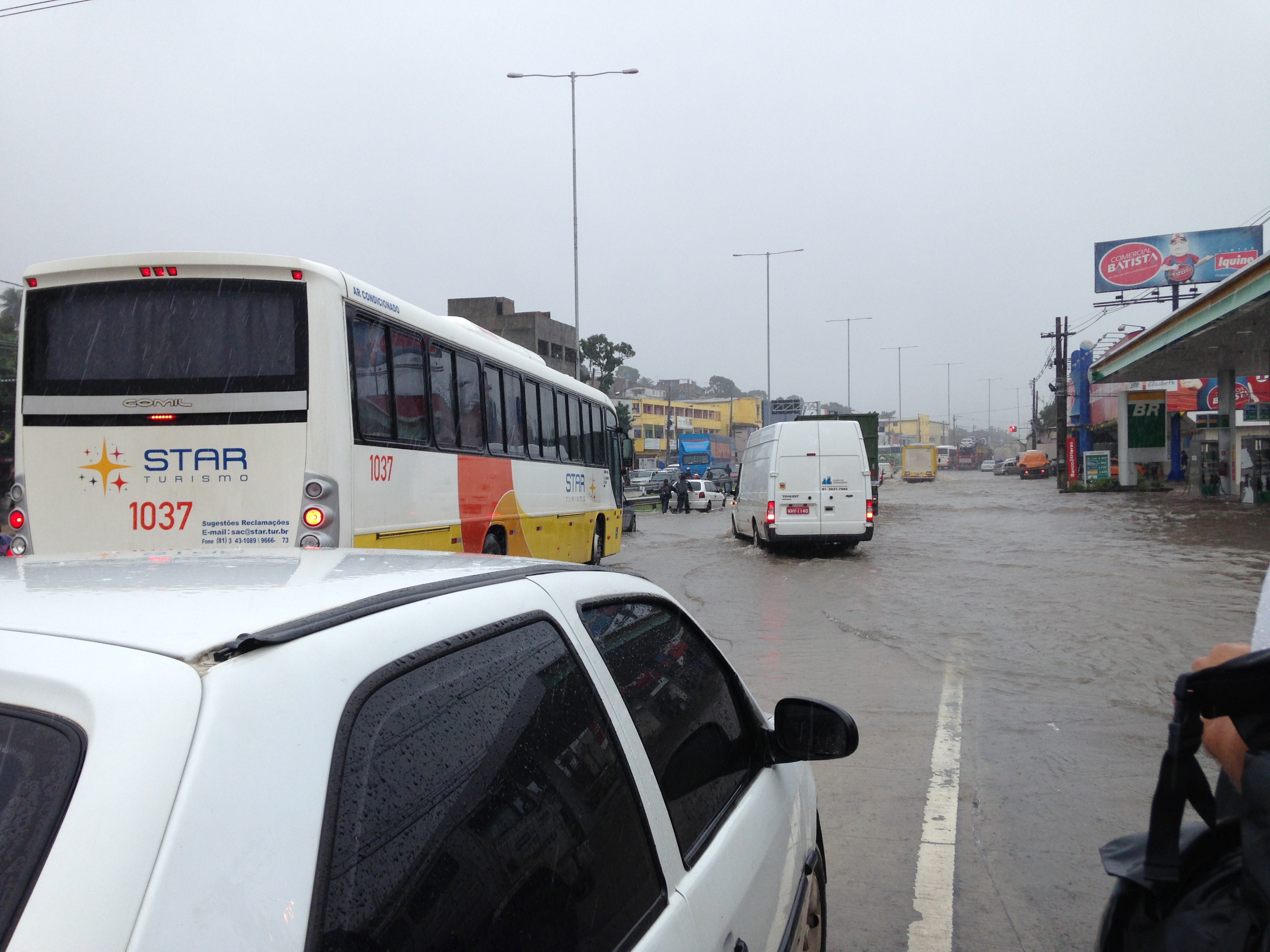 It was an even longer trip back to our hotel, as this meant the entire stadium’s worth of fans (40,000) all got on the little buses that shuttled us back to the metro station. Maybe next time they should think about building the stadium within actual walking distance of public transportation. We took the metro to Recife, then transferred to the airport, where we would try to take the bus back to PdG. The first one was packed yet again, the second was supposedly “5 minutes later” which turned out to be 45 minutes later, and while we had an orderly line forming to board the bus, once the bus arrived it sped right past us, nearly running over someone’s foot! So then it was a survival of the fittest test to get on the bus, but Doug and I got the last open seats. It was still raining on and off, but more notably, the roads had no drainage system so the entire day’s rain continued to collect in pools and lakes. After sitting in traffic, we were flying down the highway when the driver realized we were headed right into a giant lake of water too late and we hydroplaned all over the place. That was the second near-death experience of the day, as the entire bus audibly gasped when the driver slammed on his brakes and we began to careen across the lake.