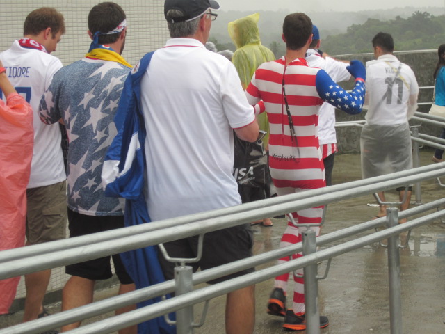 Clearly, the driver thought it’d take no time to get to the airport since he took his time making meaningless stops. And in normal circumstances, it probably would’ve taken under an hour like last night. However, upon reaching the main road to the airport, we reached a complete stop. All 4 lanes of traffic, sitting in the pouring rain, going 1/10 mile in half an hour. At this rate, we would reach the stadium by the semifinals, so we made the call to jump out and walk the last 3 miles to the airport. Clearly we were the only lunatics to conceive this idea, or else no one else cared about getting to the game in a timely manner, as we were the only ones traveling by foot in the downpour. Walking through puddles, often with standing water up to our shins, we witnessed drivers dumping buckets of water out of their backseats, and fellow Americans frustrated and ready to abandon their rental cars. It wasn’t until after we got back later that evening that we realized we narrowly avoided “Ways to die in Brazil: #35” as we could’ve been electrocuted by downed power lines.