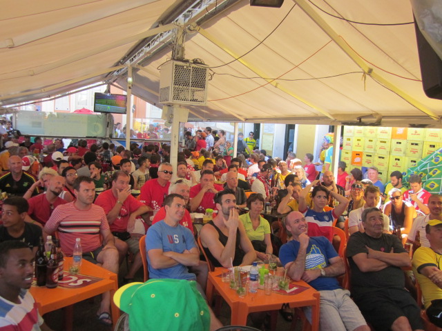 We spent the morning and early afternoon taking it all in, wandering in and out of old historic churches and little shops. Given its proximity to the arena, it was also a great area to pregame. I’m not sure if this was a regular occurrence, but there were scores of people selling beers on the cheap (as in $0.30 apiece) that one could drink publicly while enjoying the endless TV’s set up in the streets with the World Cup games. This was how we spent the good part of the afternoon – watching the Argentina-Switzerland nailbiter with fans from all over the world on the street, eating yummy street food.