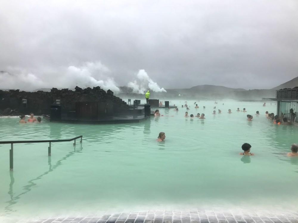 As is commonly the case with most Iceland itineraries, we stopped at the Blue Lagoon first since it was not only on the way to Reykjavik, but also a great way to freshen up after a redeye. Given its popularity with tourists, it’s pretty much a requirement to book a reservation in advance as they are almost always sold out the day of. We checked in during our allocated window, then went into the locker rooms to change, shower (a requirement before entering the lagoon), and store our stuff. For the ladies, they recommend slathering conditioner over your hair before entering the lagoon as the water otherwise will make your hair break off! The milky blue waters, normally heated anywhere from 98 to 102 degrees, hovered in the 98-99 degree range today since the cold rain cooled the lagoon significantly. Which was perfect for a pregnant mama since I had to be careful to avoid hot tub temperatures…but the water ended up a lovely bath water temperature and kept us nice and warm in the 50 degree cold! The Blue Lagoon was rather high tech as they also have screens located throughout that displayed water temperatures and depths. The water is heated by geothermal nuclear plants nearby so the water got markedly warmer as we got closer to each of the stations pumping out more heat. We floated around, mostly at chest level, and soaked up all the mineral goodness the waters offered. As part of our standard package, we also got one free drink at the swim up bar (beers for the gang and a yummy Skyr strawberry smoothie for me), as well as access to silica mud that we could slather onto our faces and wash right off in the lagoon water. It was so nice and relaxing…til we had to get out in the rainy cold to go back to the locker room!